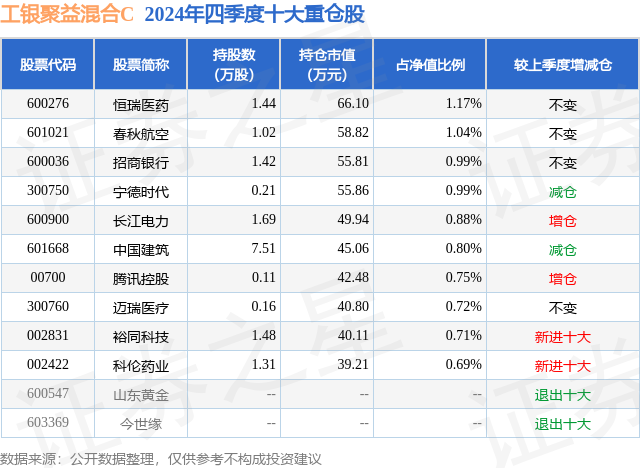 从基金规模来看,工银聚益混合C基金2024年四季度公布的基金规模为0.03亿元,较上一期规模0.48万元变化了258.85万元,环比变化了53378.39%。该基金最新一期资产配置为:股票占净值比25.2%,债券占净值比49.27%,现金占净值比25.56%。从基金持仓来看,该基金当季前十大股票仓位达8.74%,第一大重仓股为恒瑞医药(600276),持仓占比为1.17%。