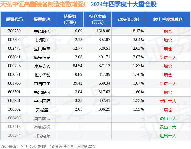 从基金规模来看,天弘中证高端装备制造指数增强C基金2024年四季度公布的基金规模为0.93亿元,较上一期规模8426.96万元变化了904.5万元,环比变化了10.73%。该基金最新一期资产配置为:股票占净值比95.17%,债券占净值比0.31%,现金占净值比4.92%。从基金持仓来看,该基金当季前十大股票仓位达25.87%,第一大重仓股为宁德时代(300750),持仓占比为8.17%。