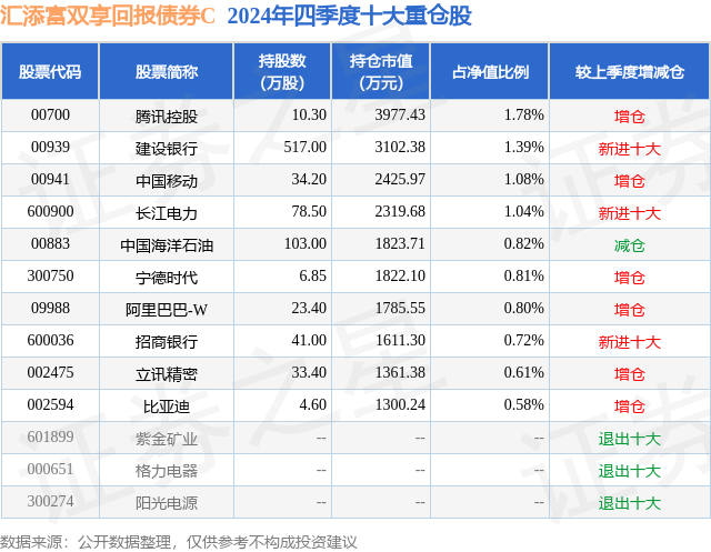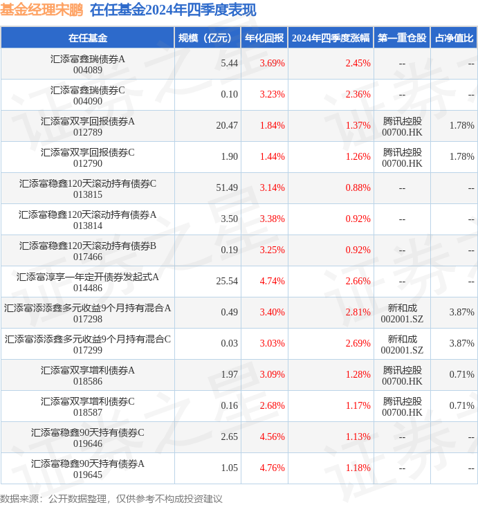 证券之星消息,日前汇添富双享回报债券C基金公布四季报,2024年四季度最新规模1.9亿元,季度净值涨幅为1.26%。