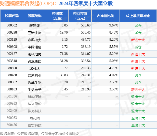 从基金规模来看,财通福盛混合发起(LOF)C基金2024年四季度公布的基金规模为0.14亿元,较上一期规模1654.97万元变化了-207.26万元,环比变化了-12.52%。该基金最新一期资产配置为:股票占净值比93.68%,债券占净值比2.19%,现金占净值比4.18%。从基金持仓来看,该基金当季前十大股票仓位达58.09%,第一大重仓股为新易盛(300502),持仓占比为9.67%。