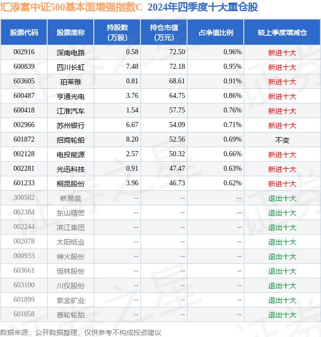 从基金规模来看,汇添富中证500基本面增强指数C基金2024年四季度公布的基金规模为0.18亿元,较上一期规模1831.54万元变化了-9.8万元,环比变化了-0.53%。该基金最新一期资产配置为:股票占净值比89.61%,无债券类资产,现金占净值比10.79%。从基金持仓来看,该基金当季前十大股票仓位达7.75%,第一大重仓股为深南电路(002916),持仓占比为0.96%。