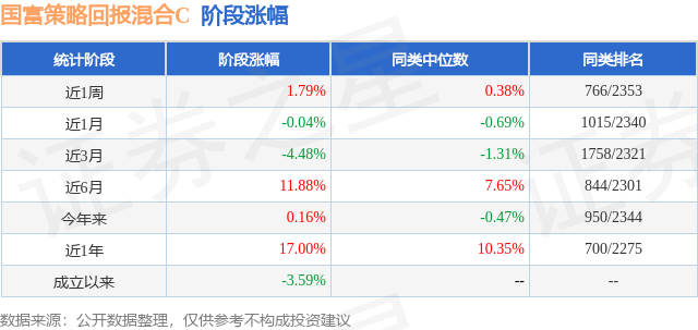 从业绩表现来看,国富策略回报混合C基金过去一年净值涨幅为17.0%,在同类基金中排名700/2275,同类基金过去一年净值涨幅中位数为10.35%。而基金过去一年的最大回撤为-12.94%,成立以来的最大回撤为-22.56%。