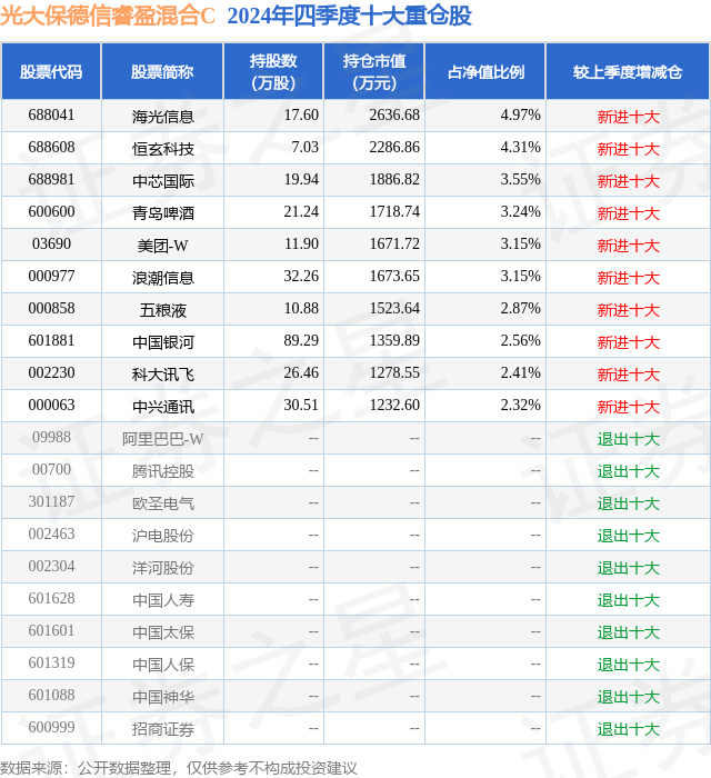 从基金规模来看,光大保德信睿盈混合C基金2024年四季度公布的基金规模为0.0亿元,较上一期规模10.71万元变化了-1.05万元,环比变化了-9.78%。该基金最新一期资产配置为:股票占净值比87.58%,债券占净值比5.76%,现金占净值比3.59%。从基金持仓来看,该基金当季前十大股票仓位达32.53%,第一大重仓股为海光信息(688041),持仓占比为4.97%。