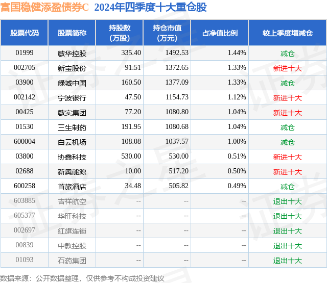 从基金规模来看,富国稳健添盈债券C基金2024年四季度公布的基金规模为6.03亿元,较上一期规模14.29亿元变化了-8.26亿元,环比变化了-57.77%。该基金最新一期资产配置为:股票占净值比18.55%,债券占净值比99.32%,现金占净值比4.98%。从基金持仓来看,该基金当季前十大股票仓位达9.8%,第一大重仓股为敏华控股(01999),持仓占比为1.44%。