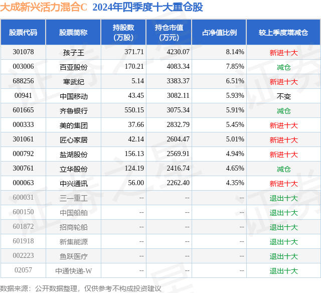 证券之星消息,日前大成新兴活力混合C基金公布四季报,2024年四季度最新规模0.77亿元,季度净值涨幅为-1.68%。