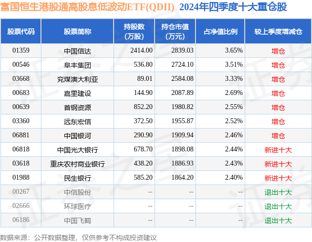 从基金规模来看,富国恒生港股通高股息低波动ETF(QDII)基金2024年四季度公布的基金规模为7.77亿元,较上一期规模4.19亿元变化了3.58亿元,环比变化了85.37%。该基金最新一期资产配置为:股票占净值比99.6%,无债券类资产,现金占净值比0.43%。从基金持仓来看,该基金当季前十大股票仓位达27.98%,第一大重仓股为中国信达(01359),持仓占比为3.65%。
