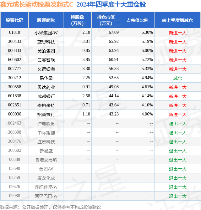 从基金规模来看,鑫元成长驱动股票发起式C基金2024年四季度公布的基金规模为0.02亿元,较上一期规模240.97万元变化了-17.66万元,环比变化了-7.33%。该基金最新一期资产配置为:股票占净值比88.18%,债券占净值比6.71%,现金占净值比4.06%。从基金持仓来看,该基金当季前十大股票仓位达51.39%,第一大重仓股为小米集团-W(01810),持仓占比为6.3%。