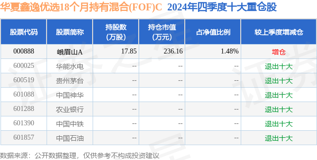 证券之星消息,日前华夏鑫逸优选18个月持有混合(FOF)C基金公布四季报,2024年四季度最新规模0.05亿元,季度净值涨幅为-2.06%。