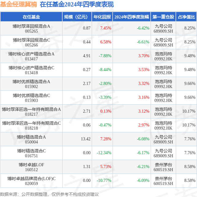 从基金规模来看,博时厚泽匠选一年持有期混合A基金2024年四季度公布的基金规模为2.71亿元,较上一期规模3.36亿元变化了-6447.04万元,环比变化了-19.21%。该基金最新一期资产配置为:股票占净值比89.46%,无债券类资产,现金占净值比14.73%。从基金持仓来看,该基金当季前十大股票仓位达64.96%,第一大重仓股为泡泡玛特(09992),持仓占比为10.17%。