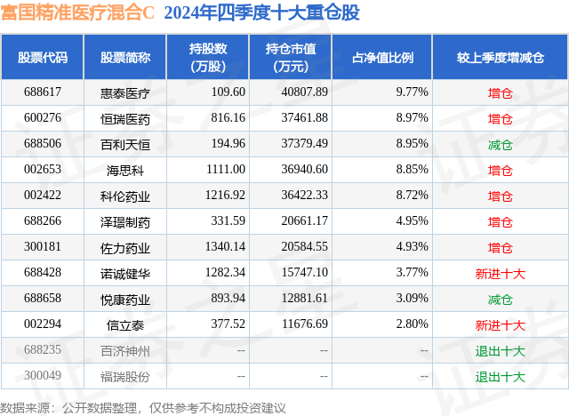 证券之星消息,日前富国精准医疗混合C基金公布四季报,2024年四季度最新规模6.53亿元,季度净值涨幅为-10.2%。