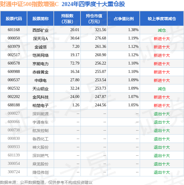 从基金规模来看,财通中证500指数增强C基金2024年四季度公布的基金规模为1.59亿元,较上一期规模2.56亿元变化了-9725.02万元,环比变化了-37.93%。该基金最新一期资产配置为:股票占净值比89.25%,无债券类资产,现金占净值比10.38%。从基金持仓来看,该基金当季前十大股票仓位达11.31%,第一大重仓股为西部矿业(601168),持仓占比为1.38%。
