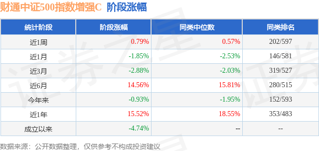 从业绩表现来看,财通中证500指数增强C基金过去一年净值涨幅为15.52%,在同类基金中排名353/483,同类基金过去一年净值涨幅中位数为18.55%。而基金过去一年的最大回撤为-18.7%,成立以来的最大回撤为-24.88%。