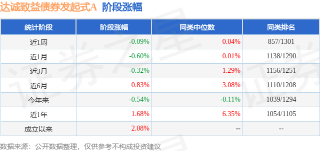 从业绩表现来看,达诚致益债券发起式A基金过去一年净值涨幅为1.68%,在同类基金中排名1054/1105,同类基金过去一年净值涨幅中位数为6.35%。而基金过去一年的最大回撤为-1.44%,成立以来的最大回撤为-1.44%。