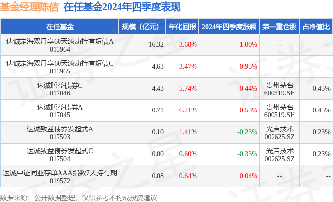 证券之星消息,日前达诚致益债券发起式A基金公布四季报,2024年四季度最新规模0.1亿元,季度净值涨幅为-0.23%。