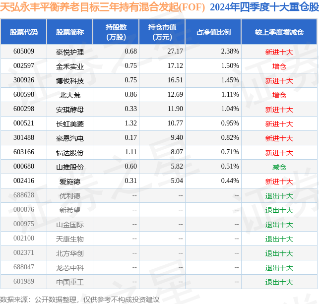 从基金规模来看,天弘永丰平衡养老目标三年持有混合发起(FOF)基金2024年四季度公布的基金规模为0.11亿元,较上一期规模1167.09万元变化了-27.54万元,环比变化了-2.36%。该基金最新一期资产配置为:股票占净值比12.34%,债券占净值比4.42%,现金占净值比7.82%。从基金持仓来看,该基金当季前十大股票仓位达10.91%,第一大重仓股为豪悦护理(605009),持仓占比为2.38%。
