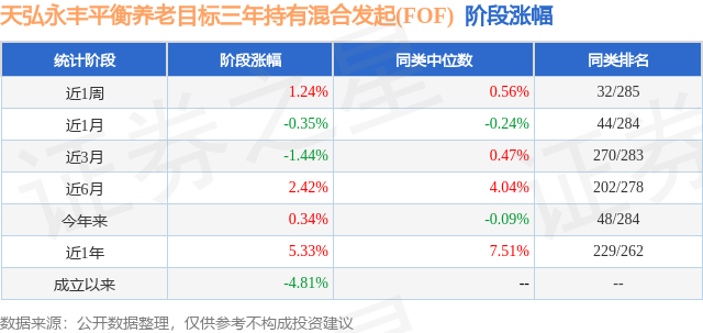 证券之星消息,日前天弘永丰平衡养老目标三年持有混合发起(FOF)基金公布四季报,2024年四季度最新规模0.11亿元,季度净值涨幅为-2.36%。