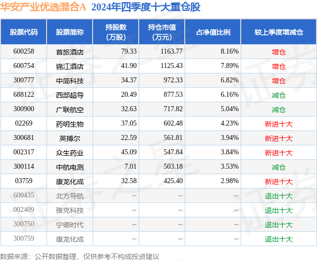 从基金规模来看,华安产业优选混合A基金2024年四季度公布的基金规模为0.69亿元,较上一期规模7346.59万元变化了-400.45万元,环比变化了-5.45%。该基金最新一期资产配置为:股票占净值比92.51%,无债券类资产,现金占净值比7.82%。从基金持仓来看,该基金当季前十大股票仓位达52.59%,第一大重仓股为首旅酒店(600258),持仓占比为8.16%。