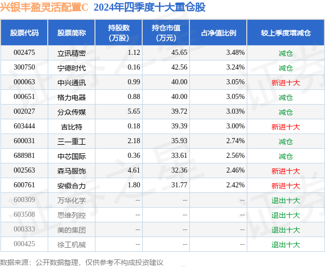 从基金规模来看,兴银丰盈灵活配置C基金2024年四季度公布的基金规模为0.0亿元,较上一期规模0.44万元变化了4.73万元,环比变化了1071.98%。该基金最新一期资产配置为:股票占净值比80.17%,债券占净值比5.37%,现金占净值比2.92%。从基金持仓来看,该基金当季前十大股票仓位达29.03%,第一大重仓股为立讯精密(002475),持仓占比为3.48%。
