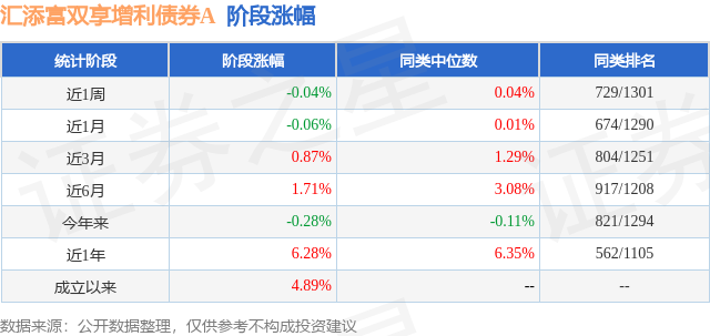 从业绩表现来看,汇添富双享增利债券A基金过去一年净值涨幅为6.28%,在同类基金中排名562/1105,同类基金过去一年净值涨幅中位数为6.35%。而基金过去一年的最大回撤为-1.15%,成立以来的最大回撤为-1.82%。