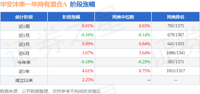 从业绩表现来看,华安沣荣一年持有混合A基金过去一年净值涨幅为4.61%,在同类基金中排名1011/1317,同类基金过去一年净值涨幅中位数为6.75%。而基金过去一年的最大回撤为-1.1%,成立以来的最大回撤为-3.6%。