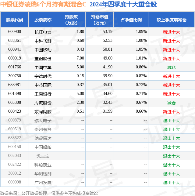 证券之星消息,日前中银证券凌瑞6个月持有期混合C基金公布四季报,2024年四季度最新规模0.23亿元,季度净值涨幅为1.26%。
