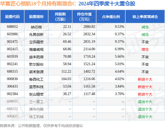 从基金规模来看,华富匠心领航18个月持有期混合C基金2024年四季度公布的基金规模为0.78亿元,较上一期规模9155.01万元变化了-1361.1万元,环比变化了-14.87%。该基金最新一期资产配置为:股票占净值比92.87%,无债券类资产,现金占净值比6.87%。从基金持仓来看,该基金当季前十大股票仓位达62.15%,第一大重仓股为纳芯微(688052),持仓占比为9.53%。