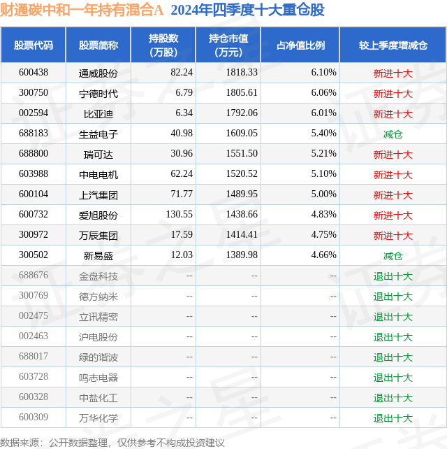 从基金规模来看,财通碳中和一年持有混合A基金2024年四季度公布的基金规模为2.91亿元,较上一期规模4.0亿元变化了-1.09亿元,环比变化了-27.26%。该基金最新一期资产配置为:股票占净值比82.91%,无债券类资产,现金占净值比11.01%。从基金持仓来看,该基金当季前十大股票仓位达53.12%,第一大重仓股为通威股份(600438),持仓占比为6.1%。
