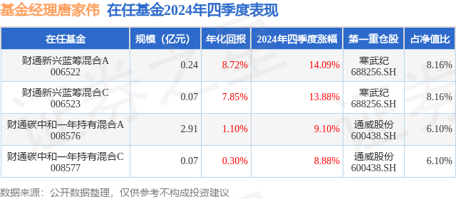 财通碳中和一年持有混合A现任基金经理为唐家伟,近期离任的基金经理为金梓才。其中在任基金经理唐家伟已从业3年又11天,2023年7月3日正式接手管理财通碳中和一年持有混合A,任职期间累计回报为13.48%。目前还管理着4只基金产品(包括A类和C类),其中本季度表现最佳的基金为财通新兴蓝筹混合A(006522),季度净值涨幅为14.09%。