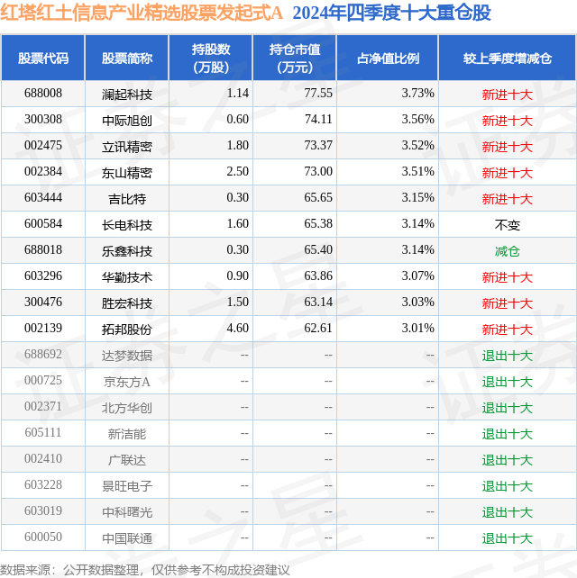 证券之星消息,日前红塔红土信息产业精选股票发起式A基金公布四季报,2024年四季度最新规模0.16亿元,季度净值涨幅为9.25%。