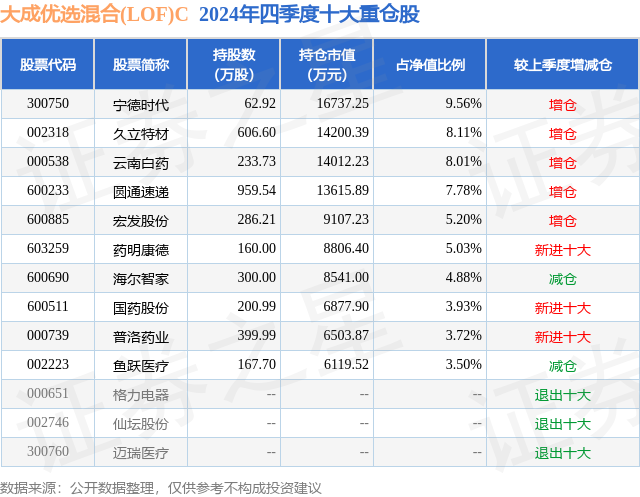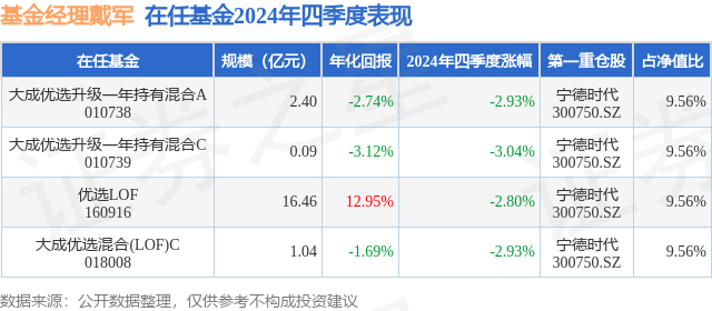 从基金规模来看,大成优选混合(LOF)C基金2024年四季度公布的基金规模为1.04亿元,较上一期规模1.82亿元变化了-7804.96万元,环比变化了-42.93%。该基金最新一期资产配置为:股票占净值比78.7%,债券占净值比7.66%,现金占净值比13.45%。从基金持仓来看,该基金当季前十大股票仓位达59.72%,第一大重仓股为宁德时代(300750),持仓占比为9.56%。