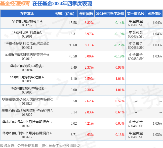 从基金规模来看,华泰柏瑞招享6个月持有期混合A基金2024年四季度公布的基金规模为3.71亿元,较上一期规模5.33亿元变化了-1.62亿元,环比变化了-30.37%。该基金最新一期资产配置为:股票占净值比18.33%,债券占净值比94.69%,现金占净值比0.86%。从基金持仓来看,该基金当季前十大股票仓位达7.02%,第一大重仓股为中金黄金(600489),持仓占比为1.03%。