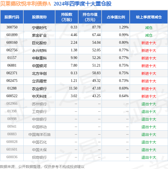 从基金规模来看,贝莱德欣悦丰利债券A基金2024年四季度公布的基金规模为0.52亿元,较上一期规模7299.09万元变化了-2061.51万元,环比变化了-28.24%。该基金最新一期资产配置为:股票占净值比19.71%,债券占净值比106.73%,现金占净值比0.64%。从基金持仓来看,该基金当季前十大股票仓位达8.18%,第一大重仓股为宁德时代(300750),持仓占比为1.29%。