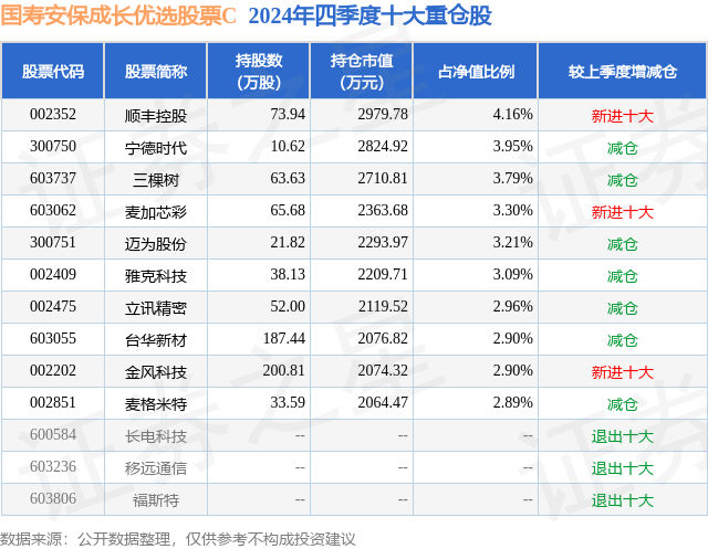 从基金规模来看,国寿安保成长优选股票C基金2024年四季度公布的基金规模为1.94亿元,较上一期规模18.04万元变化了1.94亿元,环比变化了107516.14%。该基金最新一期资产配置为:股票占净值比93.0%,无债券类资产,现金占净值比7.2%。从基金持仓来看,该基金当季前十大股票仓位达33.15%,第一大重仓股为顺丰控股(002352),持仓占比为4.16%。