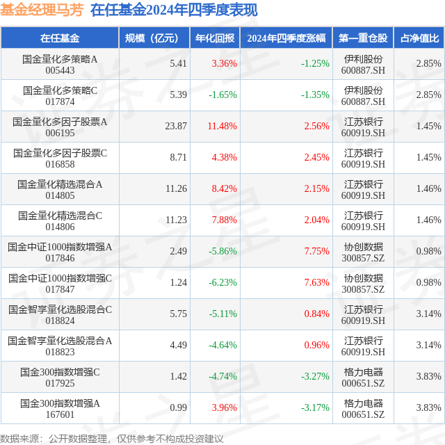 国金量化多策略C现任基金经理为姚加红 马芳。其中在任基金经理马芳已从业4年又144天,2023年2月22日正式接手管理国金量化多策略C,任职期间累计回报为-3.53%。目前还管理着12只基金产品(包括A类和C类),其中本季度表现最佳的基金为国金中证1000指数增强A(017846),季度净值涨幅为7.75%。