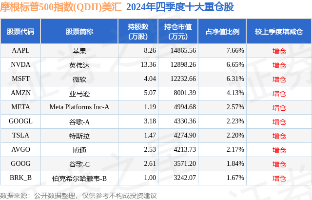 从基金规模来看,摩根标普500指数(QDII)美汇基金2024年四季度公布的基金规模为13.1亿元,较上一期规模10.38亿元变化了2.72亿元,环比变化了26.15%。该基金最新一期资产配置为:股票占净值比93.75%,无债券类资产,现金占净值比6.81%。从基金持仓来看,该基金当季前十大股票仓位达37.43%,第一大重仓股为苹果(AAPL),持仓占比为7.66%。