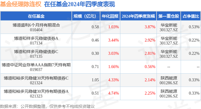 从基金规模来看,博道和祥多元稳健债券C基金2024年四季度公布的基金规模为0.3亿元,较上一期规模4533.26万元变化了-1560.18万元,环比变化了-34.42%。该基金最新一期资产配置为:股票占净值比19.42%,债券占净值比101.51%,现金占净值比6.09%。从基金持仓来看,该基金当季前十大股票仓位达1.68%,第一大重仓股为华宝新能(301327),持仓占比为0.22%。