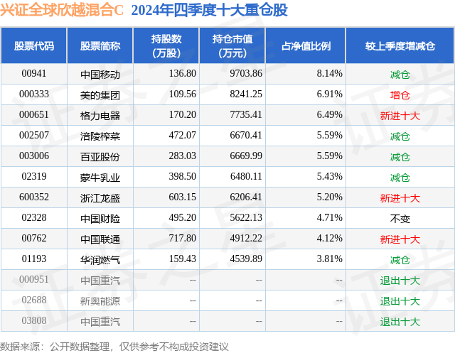 从基金规模来看,兴证全球欣越混合C基金2024年四季度公布的基金规模为3.74亿元,较上一期规模4.92亿元变化了-1.18亿元,环比变化了-23.95%。该基金最新一期资产配置为:股票占净值比68.92%,无债券类资产,现金占净值比30.94%。从基金持仓来看,该基金当季前十大股票仓位达55.99%,第一大重仓股为中国移动(00941),持仓占比为8.14%。