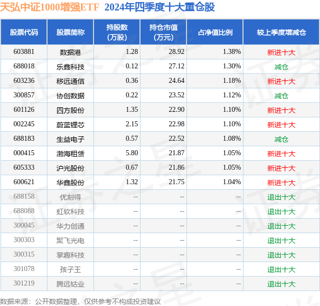 从基金规模来看,天弘中证1000增强ETF基金2024年四季度公布的基金规模为0.21亿元,较上一期规模2475.91万元变化了-385.29万元,环比变化了-15.56%。该基金最新一期资产配置为:股票占净值比93.34%,无债券类资产,现金占净值比5.51%。从基金持仓来看,该基金当季前十大股票仓位达11.4%,第一大重仓股为数据港(603881),持仓占比为1.38%。