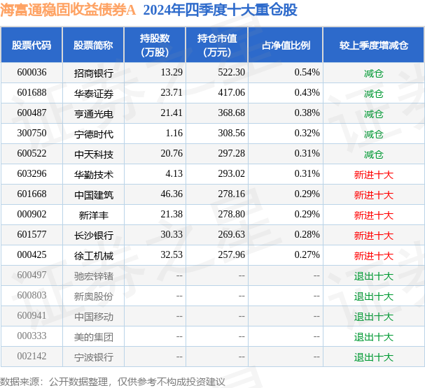 从基金规模来看,海富通稳固收益债券A基金2024年四季度公布的基金规模为5.14亿元,较上一期规模5.27亿元变化了-1307.55万元,环比变化了-2.48%。该基金最新一期资产配置为:股票占净值比18.51%,债券占净值比108.21%,现金占净值比3.03%。从基金持仓来看,该基金当季前十大股票仓位达3.42%,第一大重仓股为招商银行(600036),持仓占比为0.54%。