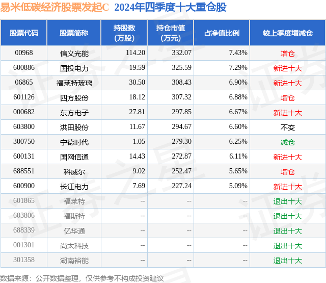 从基金规模来看,易米低碳经济股票发起C基金2024年四季度公布的基金规模为0.05亿元,较上一期规模266.85万元变化了196.55万元,环比变化了73.66%。该基金最新一期资产配置为:股票占净值比83.77%,无债券类资产,现金占净值比5.59%。从基金持仓来看,该基金当季前十大股票仓位达64.87%,第一大重仓股为信义光能(00968),持仓占比为7.43%。