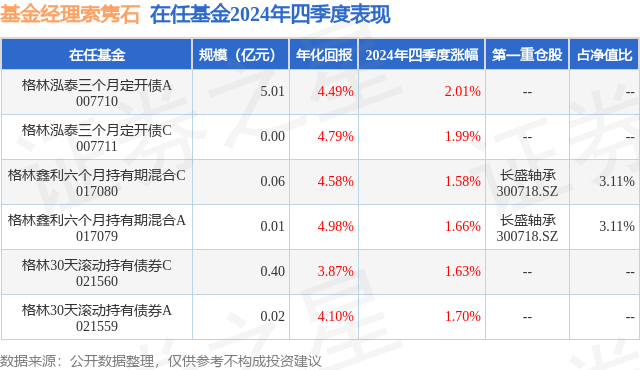 证券之星消息,日前格林鑫利六个月持有期混合A基金公布四季报,2024年四季度最新规模0.01亿元,季度净值涨幅为1.66%。