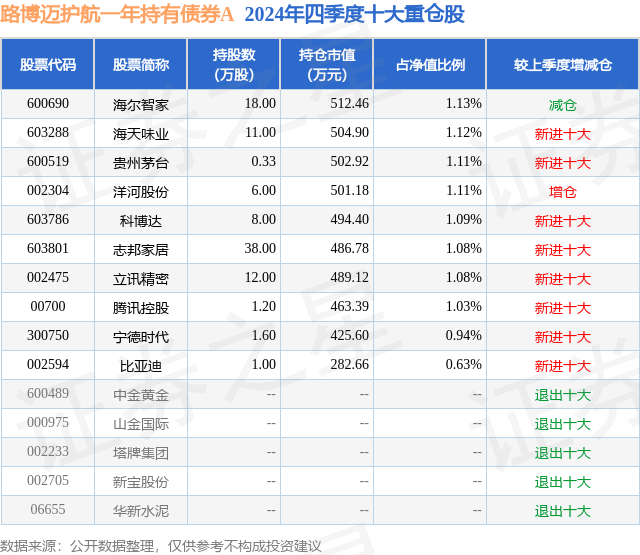 从基金规模来看,路博迈护航一年持有债券A基金2024年四季度公布的基金规模为2.91亿元,较上一期规模4.49亿元变化了-1.58亿元,环比变化了-35.3%。该基金最新一期资产配置为:股票占净值比12.91%,债券占净值比92.63%,现金占净值比1.33%。从基金持仓来看,该基金当季前十大股票仓位达10.32%,第一大重仓股为海尔智家(600690),持仓占比为1.13%。