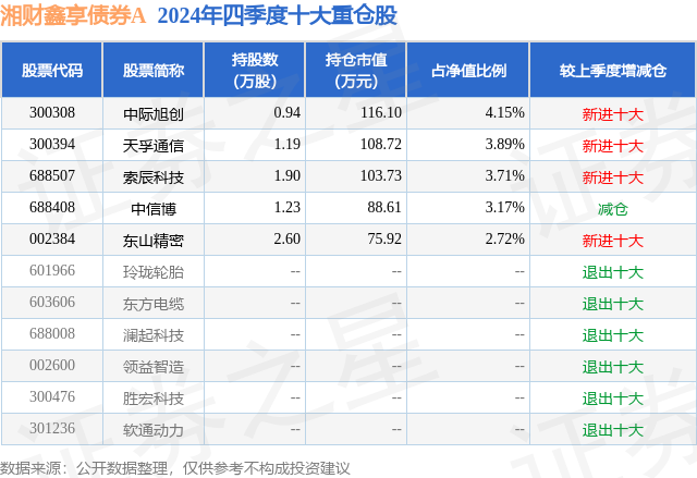 从基金规模来看,湘财鑫享债券A基金2024年四季度公布的基金规模为0.24亿元,较上一期规模4450.15万元变化了-2072.64万元,环比变化了-46.57%。该基金最新一期资产配置为:股票占净值比17.64%,债券占净值比82.95%,现金占净值比1.8%。从基金持仓来看,该基金当季前十大股票仓位达17.64%,第一大重仓股为中际旭创(300308),持仓占比为4.15%。