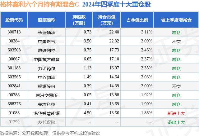 从基金规模来看,格林鑫利六个月持有期混合C基金2024年四季度公布的基金规模为0.06亿元,较上一期规模781.2万元变化了-162.21万元,环比变化了-20.76%。该基金最新一期资产配置为:股票占净值比27.61%,无债券类资产,现金占净值比70.48%。从基金持仓来看,该基金当季前十大股票仓位达23.11%,第一大重仓股为长盛轴承(300718),持仓占比为3.11%。