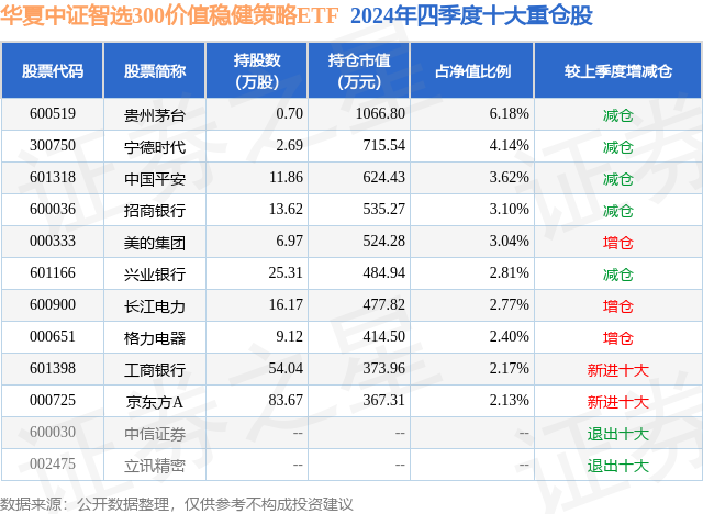 从基金规模来看,华夏中证智选300价值稳健策略ETF基金2024年四季度公布的基金规模为1.73亿元,较上一期规模1.74亿元变化了-127.69万元,环比变化了-0.73%。该基金最新一期资产配置为:股票占净值比99.3%,无债券类资产,现金占净值比2.43%。从基金持仓来看,该基金当季前十大股票仓位达32.36%,第一大重仓股为贵州茅台(600519),持仓占比为6.18%。