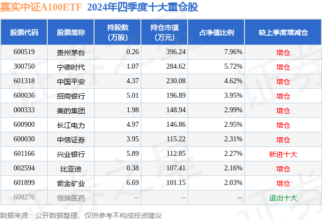 从基金规模来看,嘉实中证A100ETF基金2024年四季度公布的基金规模为0.5亿元,较上一期规模4089.22万元变化了889.54万元,环比变化了21.75%。该基金最新一期资产配置为:股票占净值比98.32%,无债券类资产,现金占净值比2.04%。从基金持仓来看,该基金当季前十大股票仓位达36.96%,第一大重仓股为贵州茅台(600519),持仓占比为7.96%。