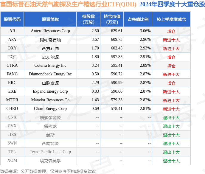 从基金规模来看,富国标普石油天然气勘探及生产精选行业ETF(QDII)基金2024年四季度公布的基金规模为2.06亿元,较上一期规模1.17亿元变化了8900.94万元,环比变化了76.29%。该基金最新一期资产配置为:股票占净值比99.57%,无债券类资产,现金占净值比0.46%。从基金持仓来看,该基金当季前十大股票仓位达28.99%,第一大重仓股为Antero Resources Corp(AR),持仓占比为3.06%。
