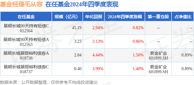 从基金规模来看,景顺长城景颐裕利债券C基金2024年四季度公布的基金规模为0.4亿元,较上一期规模5291.57万元变化了-1299.06万元,环比变化了-24.55%。该基金最新一期资产配置为:股票占净值比4.38%,债券占净值比125.69%,现金占净值比15.29%。从基金持仓来看,该基金当季前十大股票仓位达2.57%,第一大重仓股为紫金矿业(601899),持仓占比为0.89%。