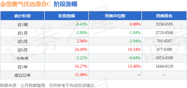从业绩表现来看,金信景气优选混合C基金过去一年净值涨幅为16.27%,在同类基金中排名1644/4129,同类基金过去一年净值涨幅中位数为13.48%。而基金过去一年的最大回撤为-25.21%,成立以来的最大回撤为-25.21%。