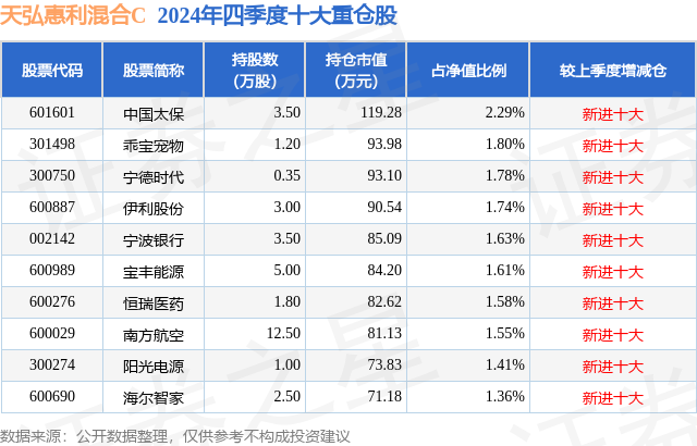 从基金规模来看,天弘惠利混合C基金2024年四季度公布的基金规模为0.0亿元,较上一期规模1.44万元变化了-0.93万元,环比变化了-64.44%。该基金最新一期资产配置为:股票占净值比19.41%,债券占净值比75.76%,现金占净值比7.15%。从基金持仓来看,该基金当季前十大股票仓位达16.75%,第一大重仓股为中国太保(601601),持仓占比为2.29%。